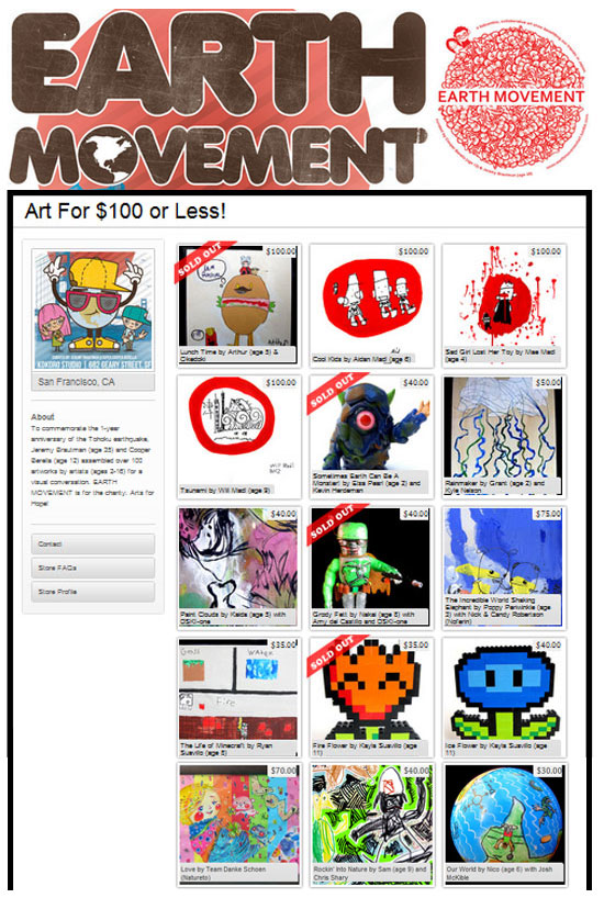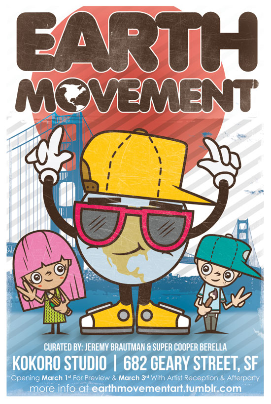 San Francisco, a city that’s no stranger to “earth movement,” was our ideal location for the show. EARTH MOVEMENT’s young artists came from all over the USA, plus Japan, France, Russia, Germany, Scotland and Australia. Their collaborators included familiar names from contemporary art, pop surrealism and toy design who shared a common bond of love for Japanese art and culture. EARTH MOVEMENT featured original drawings, paintings, sculpture, photography, prints and more. All work was available for purchase with 20-75% of each sale donated to Arts for Hope in Japan. The EARTH MOVEMENT tumblr site contains the original press release, artist list, sponsors, photos and more.