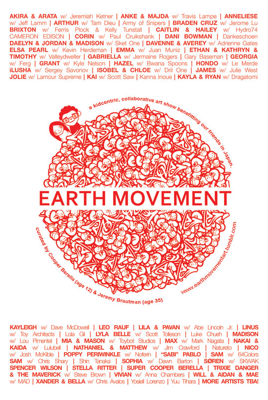 While I was curating LOVE MOVEMENT, I became friends with an optimistic 12-year-old art curator named Super Cooper. Fast forward a year, and we were mounting an art show to commemorate the first anniversary of the Tōhoku earthquake and tsunami, which had struck Japan just after LOVE MOVEMENT’s Japanese artists had returned home. The magnitude 9.0 earthquake claimed the lives of more than 15,000 people, triggered nuclear accidents and moved earth on its axis. Cooper and I thought a lot about how people (particularly young people) processed this information. And so we invited over 50 emerging artists (ages 2-16) to collaborate with established artists (family and friends) on artwork about nature’s powerful forces.
